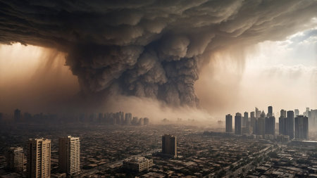 A colossal dust storm looms over a sprawling city, engulfing the skyline with thick clouds of dust and creating an apocalyptic scene, as sunlight struggles to penetrate the dense atmosphere. AI generated image