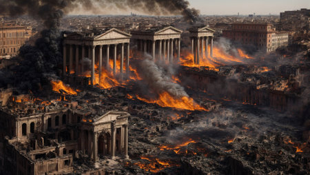 A devastated cityscape with buildings in ruins, fires burning, and dark smoke filling the ominous sky.
