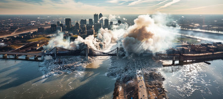 A large explosion has occurred at a bridge in St. Louis, creating smoke clouds, with the river and city skyline visible in the background under natural light.