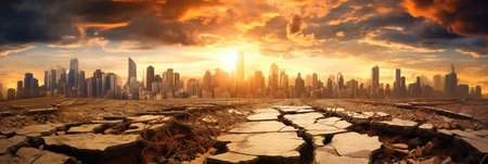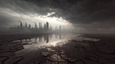 A stunning urban landscape showcasing a dramatic city skyline under ominous clouds with cracked earth and reflective water surface, evoking tension.