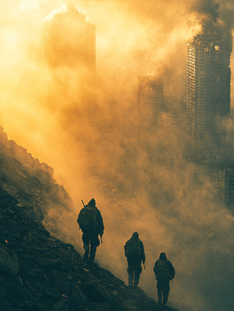 Three soldiers navigate a devastated urban landscape filled with smoke and debris. They move carefully over rugged terrain as distant structures loom in the hazy background, hinting at chaos.