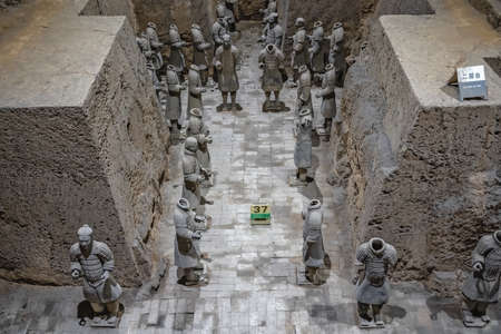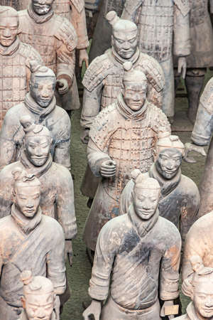 Xian, China - July 2019 : Standing clay soldiers forming part of an army of terracota warriors, created during the reign of first chinese emperor Qin Shi Huang Di, Shaanxi Province