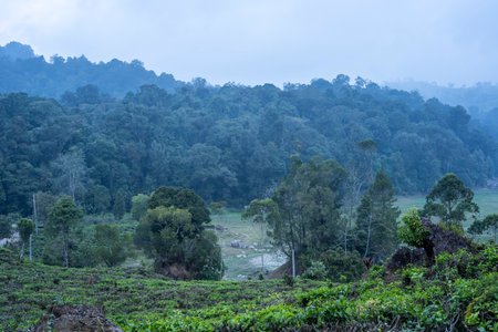Blur background of fog enveloped tea plantation hills at dawn. Tea field landscape with mountain photography. Serenity and nature concept. Design for calming wall art, environmental poster. Spate.