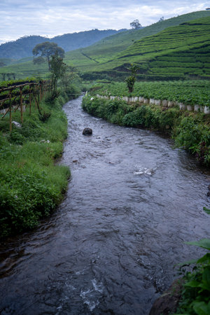 Small river in the middle of tea plantation. nature concept