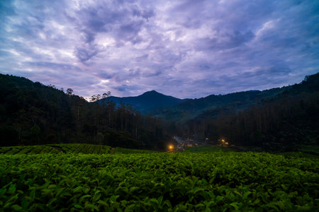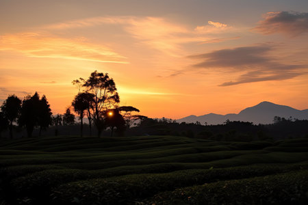 tea plantation sunset, with silhouette of mountains in the background, created with generative ai