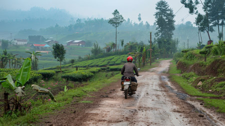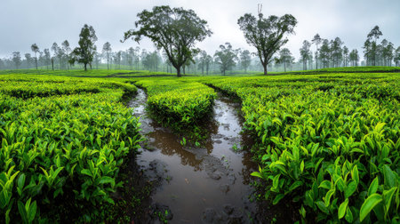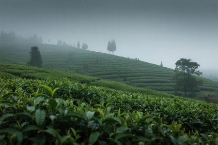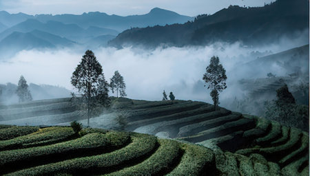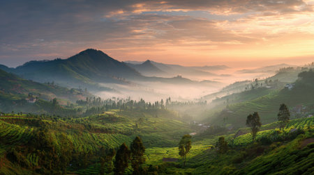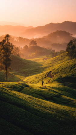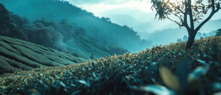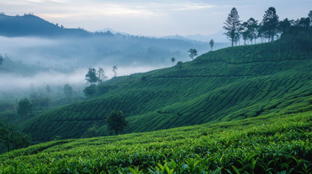 A beautiful tea plantation landscape captured at dawn, featuring rolling hills covered in vibrant greenery and soft mist, creating a serene and tranquil atmosphere.