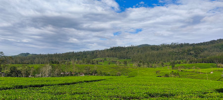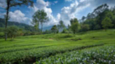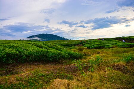 Tea garden view with cloudy clouds. Green nature blured background for your text