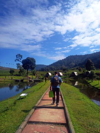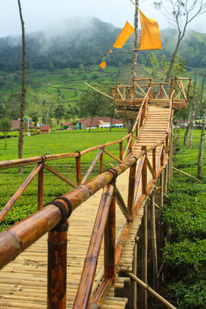 A wooden bamboo bridge stands between the Tambi tea garden and the mountains in Wonosobo Regency, Indonesia.