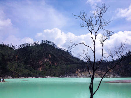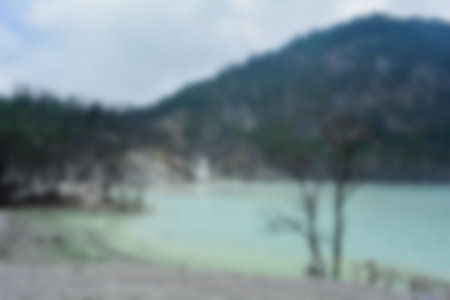 Blurred view of Kawah Putih (white crater), a hot volcanic lake. Tourist destination in South of Bandung, West Java, Indonesia.