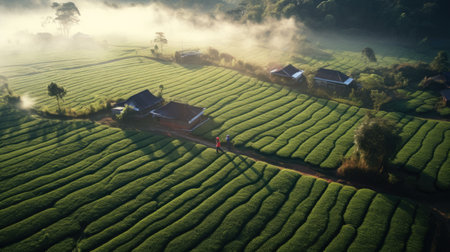 Aerial view of tea plantation is foggy in the morning, vietnam. Generative Ai
