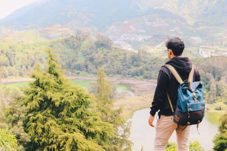 Young asian backpacker man is happy and enjoy traveling in mountain.