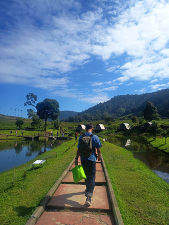 Hiker with backpack walking along river path towards green valley under blue sky