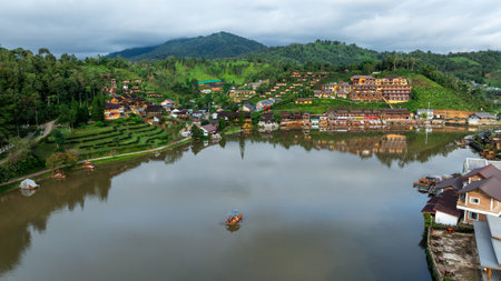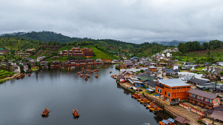 Aerial view of tranquil lakeside village nestled in lush, mist-covered hills under an overcast sky. The calm water reflects the vibrant buildings, raft creating a serene and picturesque scene.