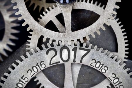 Macro photo of tooth wheel mechanism with numbers 2015, 2016, 2017, 2018 and 2019 imprinted on clean metal surface; New Year concept