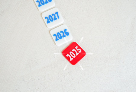 White cubes with black numbers lined up in a row symbolize the year 2027 and lie on an old wooden table outdoors