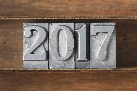 The year 2017 written in rusted metal letters surrounded by vintage wooden and metal letterpress type.