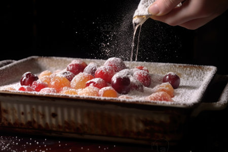 sprinkling sugar on top of uncooked cobbler, created with generative ai