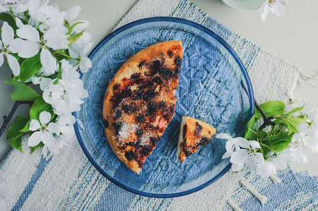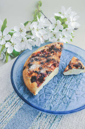 chopped homemade simple berry biscuit cake made of raspberries and strawberries sprinkled with sugar on a blue transparent glass round plate on a blue napkin and sprig of white flowers of a pear tree