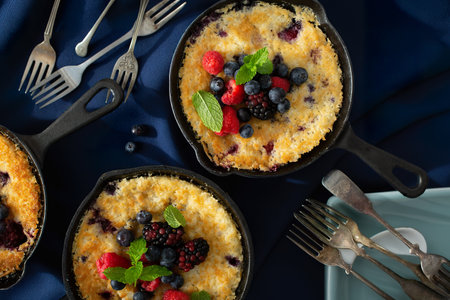 Berry crumble baked in small cast iron pans, individual desserts, top view