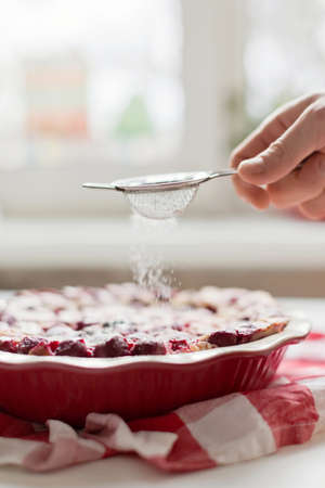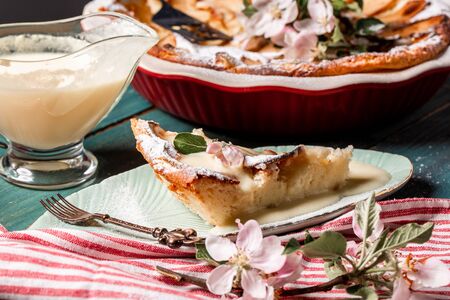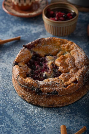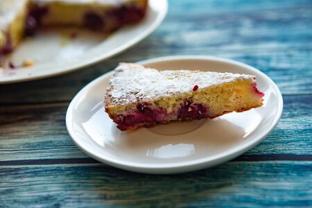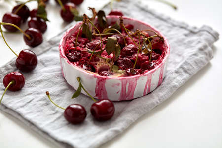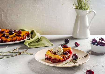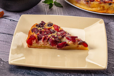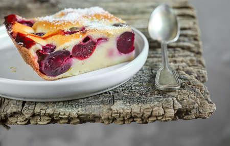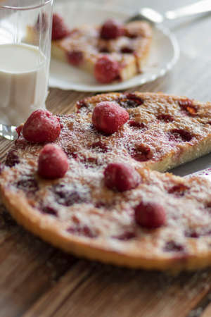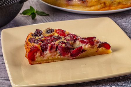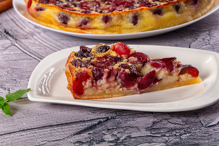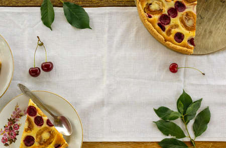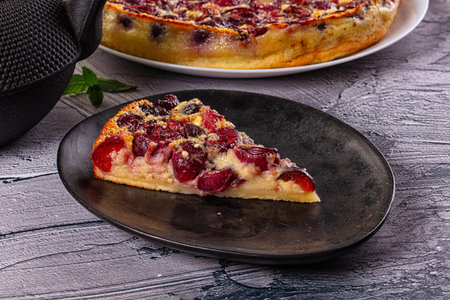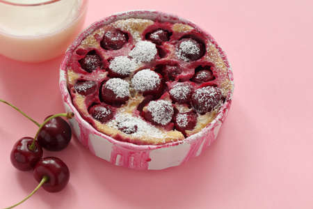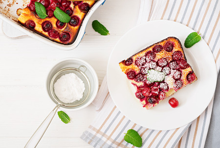 Cherry pie with cream filling, french dessert clafoutis with red sweet cherries, sugar powder. Baking dish with tasty tart