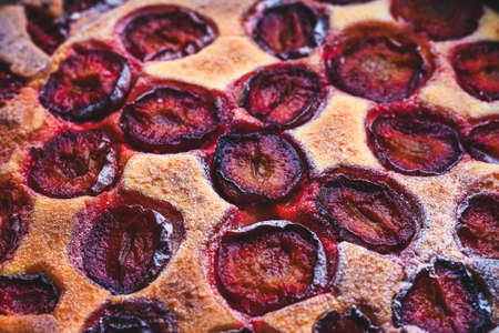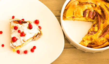 delicious homemade curd cake with red round plum close-up