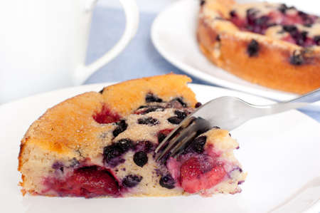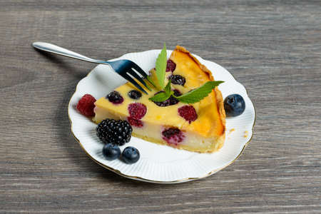 Piece of pie with blueberries, rasberry and mint for dessert on a white plate, napkin. Pieces of delicious homemade cake on a background