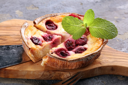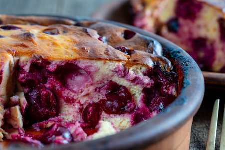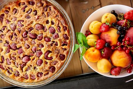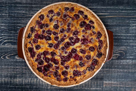Clafoutis with cherry on a wooden background, traditional French sweet fruit dessert.