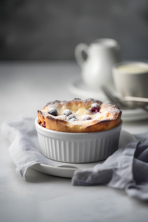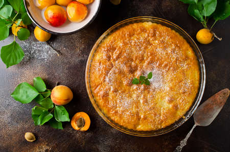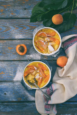 Clafouti with apricots in rameken on blue wooden background. Fruits clafoutis. Sweet casserole. Traditional French cake. Copy space