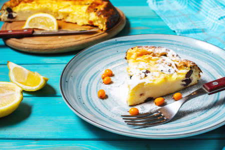 Cottage cheese casserole with blueberries and powdered sugar, selective focus