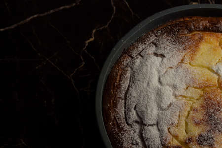 cottage cheese dessert baked in portioned round ceramic plates on a wooden black table, top view