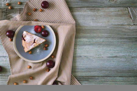 Berry pie on a saucer on a wooden table. Side view.