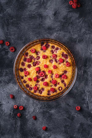 Sweet tasty pie with jellied and fresh raspberry fruits in baking dish, dark stone concrete background, top view