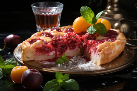 Tasty pie with red fruit juice on the marble surface, generative AI