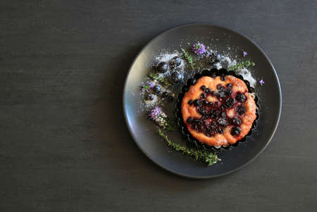 Summer food concept homemade freash baked organic cherry tarts or pie on black slate board with copy space