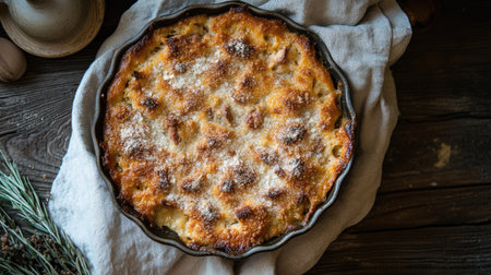cottage cheese dessert baked in portioned round ceramic plates on a wooden table, top view, copy space