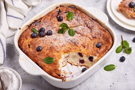 Cottage cheese casserole with blueberries. Healthy dish for the family.