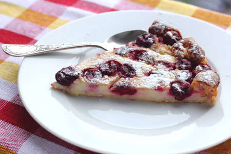 A slice of homemade clafoutis dessert - traditional french cherry pie, fresh cherry berries and a teaspoon on a white plate on a white wooden table, close up