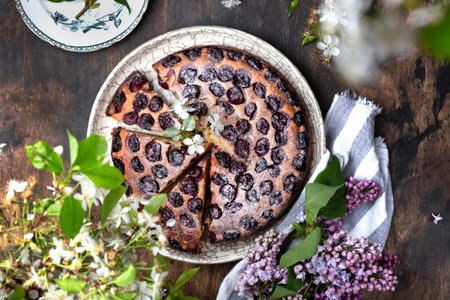 A portioned plate with clafoutis on a wooden background on a bright sunny day. Traditional French pie with cherry clafoutis. Top view