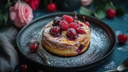 A plate of clafoutis with baked cherries in a golden batter, dusted with powdered sugar.