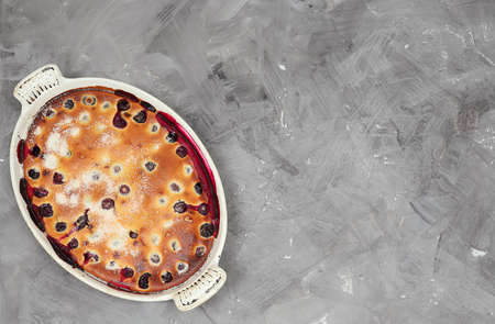 Homemade clafoutis cherry pie - traditional french dessert in a white baking dish isolated on a gray background with copy space, top view