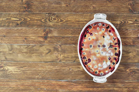 Homemade clafoutis cherry pie - traditional french dessert in a white baking dish isolated on a wooden background with copy space, top view