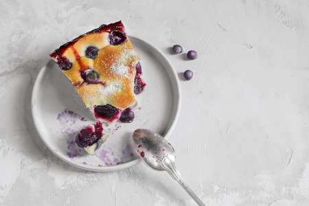 A slice of homemade clafoutis cherry pie - traditional french tart in a gray plate with a spoon on a gray background top view