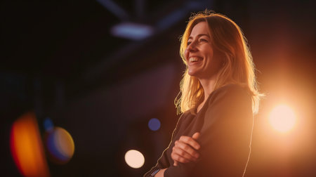 A woman is depicted smiling, illuminated by sunlight. The portrait highlights her facial expression and natural skin tone. The lighting creates shadows on a neutral background. This image could be utilized for various commercial purposes, including advertising and editorial content.