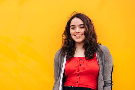 A young woman with curly brown hair stands in front of a brightly painted wall, smiling brightly.