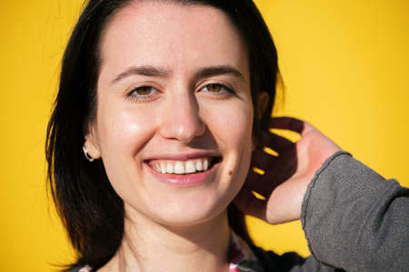portrait of a happy young girl smiling with a yellow background, concept of protection against covid pandemic, concept of happiness and optimism