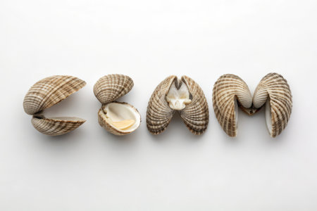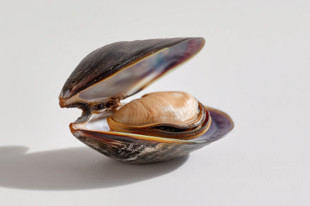 Mussel opens to reveal soft flesh and iridescent interior. Minimalist white background emphasizes delicate details. Concept of seafood, culinary arts, ocean cuisine.