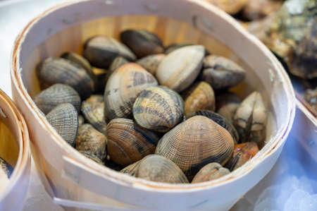 Fresh uncooked vongole clams for make of italian seafood dish spaghetti vongole for sale on Italian market