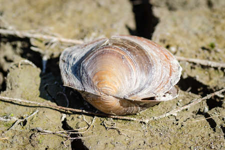 A river shell, Unio pictorum on a cracked muddy dry surface. Freshwater river mussel, Unio pictorum on the cracked muddy dry surface of the river bed.