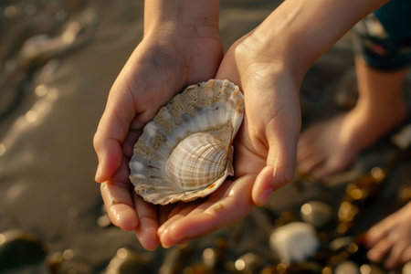 A person is holding a shell in their hand. The shell is white and has a brown spot on it. The person is standing on a beach, and the rocks around them are scattered. Concept of relaxation and leisure