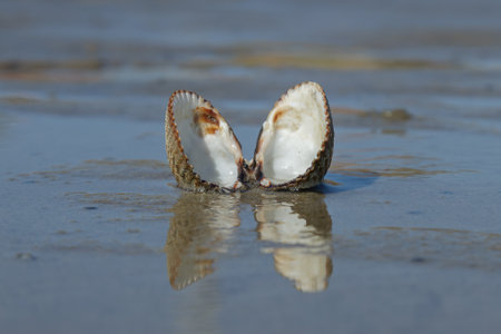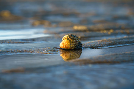 Seashell resting in shallow water with a soft reflection on the wet sand.